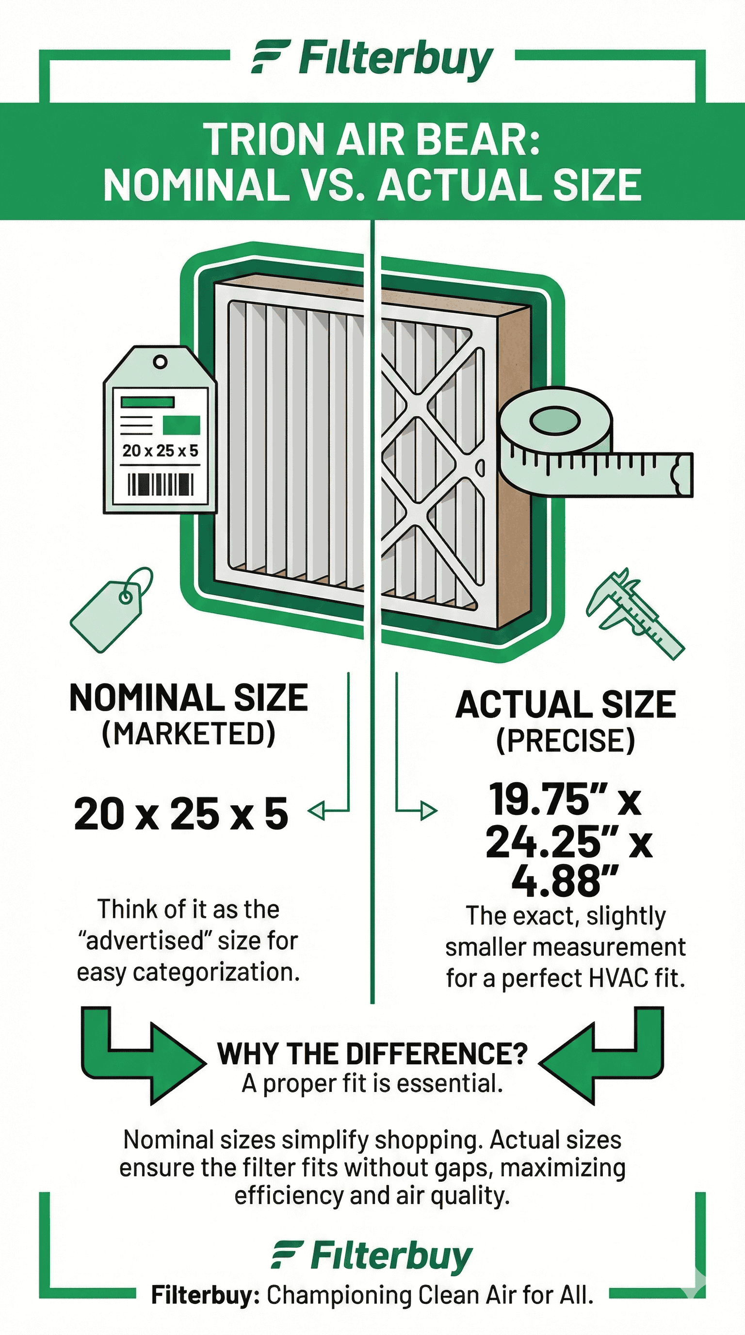 Don't let filter sizing confusion leave your home's air unprotected! If you've ever wondered why your Trion Air Bear filter doesn't quite match the dimensions printed on the box, you're not alone. After manufacturing filters for over a decade and helping millions of customers find the right fit, we've learned that understanding the difference between actual and nominal sizes is the key to optimal air filtration. Nominal size refers to the rounded, marketing-friendly dimensions you see advertised—like 16x25x5. Actual size, however, tells the real story: precise measurements that typically run about ¼ inch smaller per dimension to ensure your filter slides smoothly into its housing. For example, a 16x25x5 nominal Air Bear filter actually measures 15.75" x 24.25" x 4.88". This small difference makes a big impact—get it right, and your filter captures airborne contaminants efficiently while protecting your HVAC system. Get it wrong, and you risk air bypass, reduced efficiency, and compromised indoor air quality. Here's exactly what you need to know to protect your family and breathe easier.